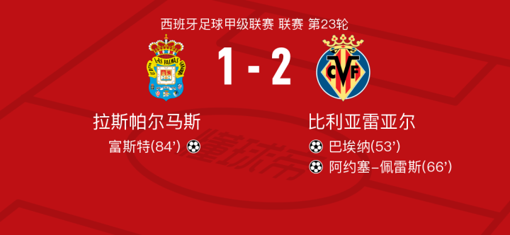 西班牙足球甲级联赛:拉斯帕尔马斯1-2比利亚雷亚尔