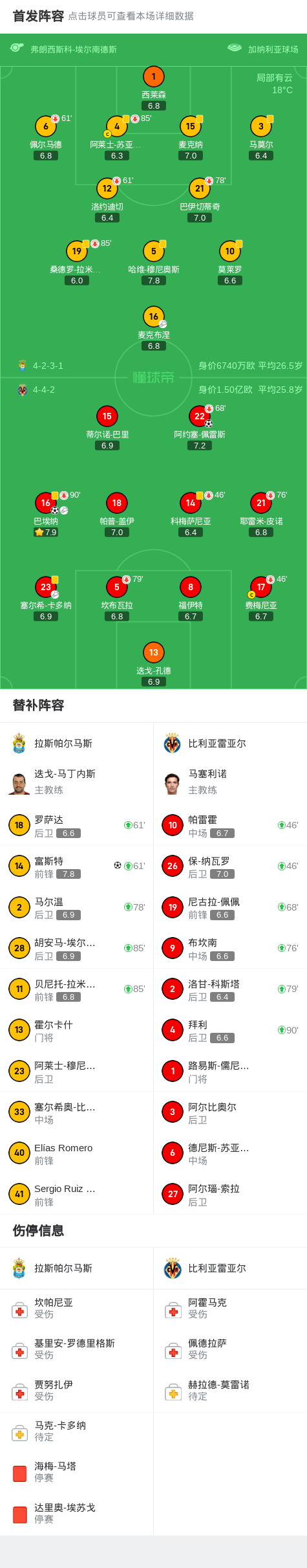 比赛进入补时阶段,拉斯帕尔马斯在努力寻找机会扳平比分,而比利亚雷亚尔则稳固防守,不让对手有太多机会。最终,裁判吹响了全场结束的哨音,比利亚雷亚尔凭借两粒进球取得了一场重要的客场胜利,而拉斯帕尔马斯则未能守住主场。